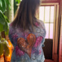 Dit spijkerjack heeft een uniek handgeschilderd ontwerp op de achterkant. Een groot rood hart in het midden, omringd door roze veren en bloemen. Sierlijke krullen en lijnen maken het ontwerp romantisch en artistiek. Witte verfspetters geven het jack een speelse uitstraling. Dit is een opvallend en uniek kledingstuk, perfect voor wie van een gedurfde look houdt!